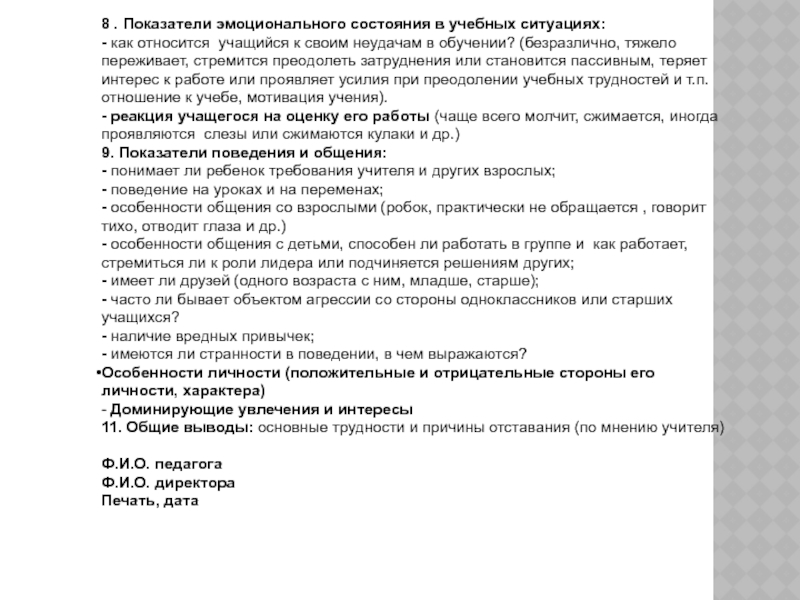 к своим неудачам в обучении? (безразлично, тяжело переживает, стремится преодолеть затруднения или становится пассивным, теряет интерес к работе или проявляет усилия при преодолении учебных трудностей и т.п. отношение к учебе, мотивация учения).