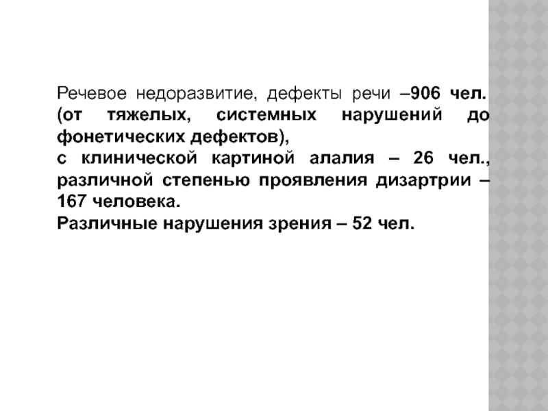 Слайд 10Речевое недоразвитие, дефекты речи –906 чел. (от тяжелых, системных нарушений до