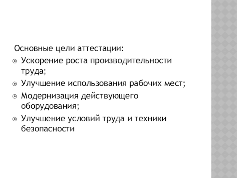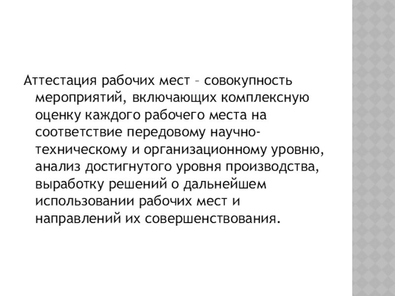 Слайд 13Аттестация рабочих мест – совокупность мероприятий, включающих комплексную оценку каждого рабочего