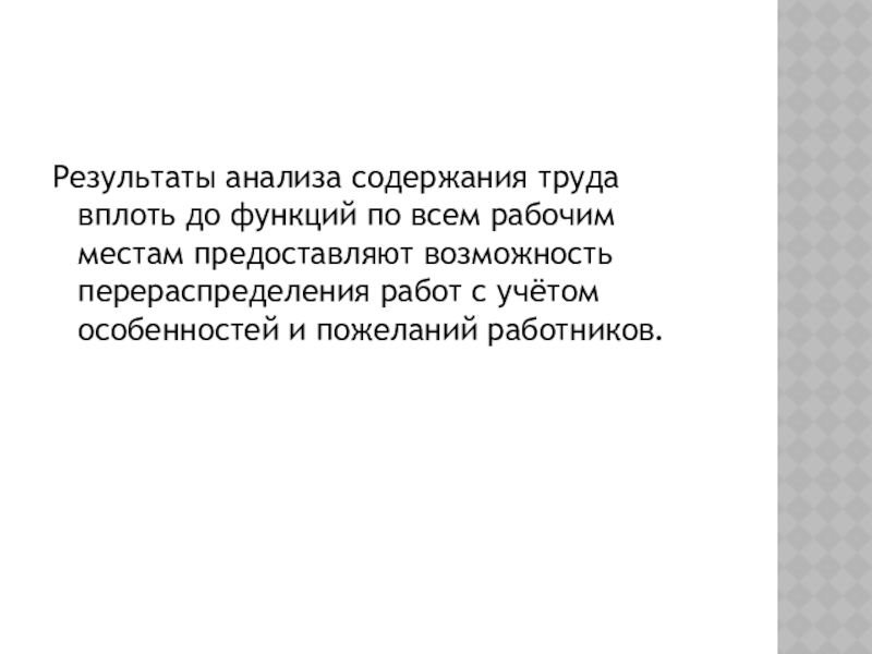 Слайд 4Результаты анализа содержания труда вплоть до функций по всем рабочим местам
