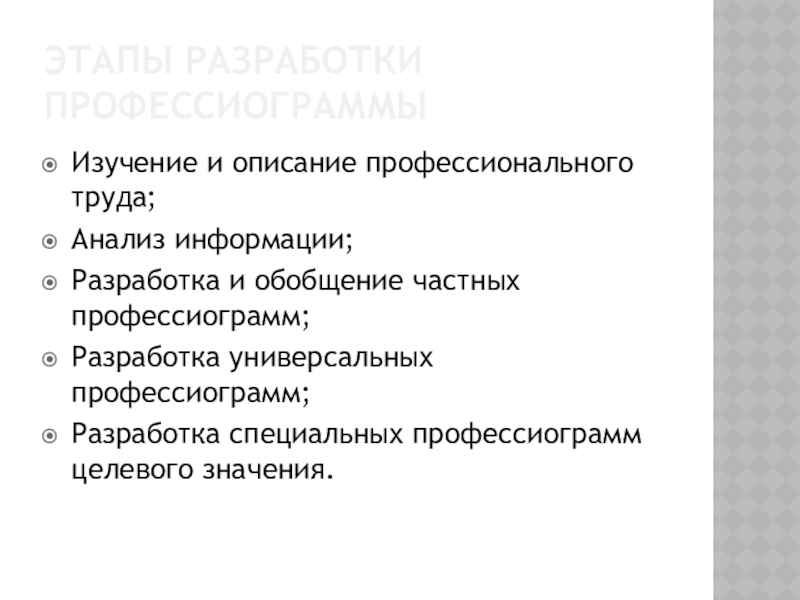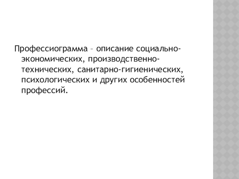 Слайд 7Профессиограмма – описание социально-экономических, производственно-технических, санитарно-гигиенических, психологических и других особенностей профессий.