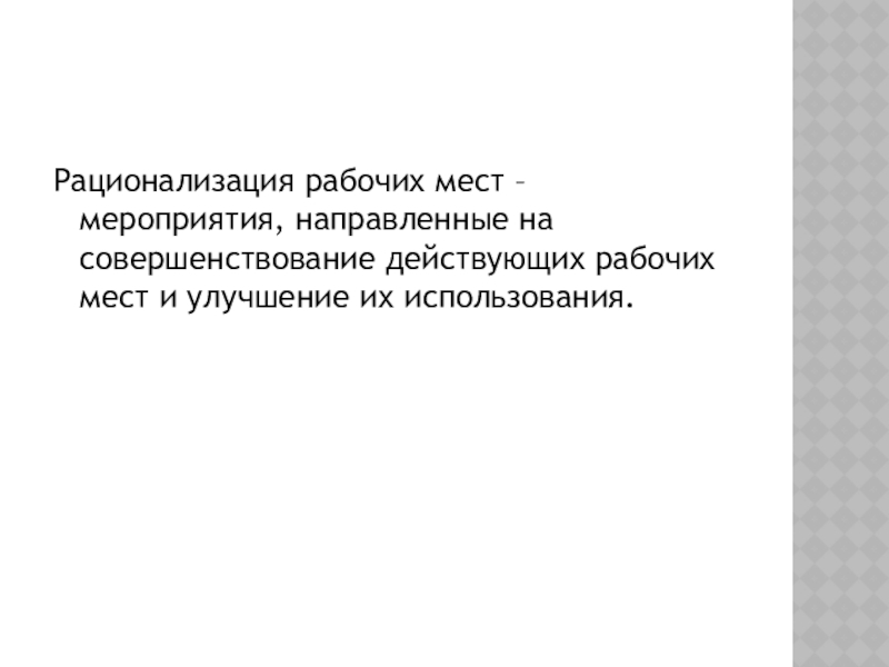Слайд 14Рационализация рабочих мест – мероприятия, направленные на совершенствование действующих рабочих мест