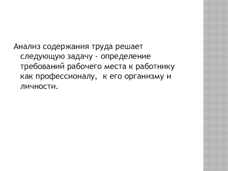 Слайд 5Анализ содержания труда решает следующую задачу - определение требований рабочего места