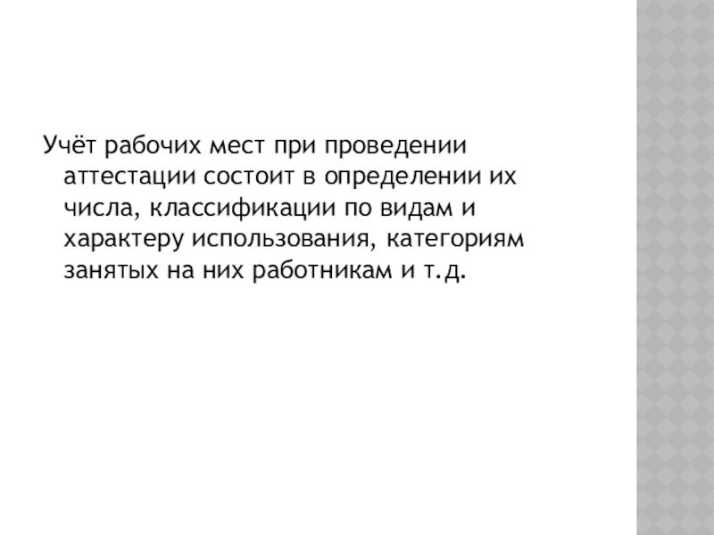 Слайд 12Учёт рабочих мест при проведении аттестации состоит в определении их числа,