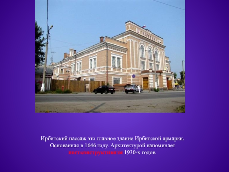 Слайд 36Ирбитский пассаж это главное здание Ирбитской ярмарки. Основанная в 1646 году.