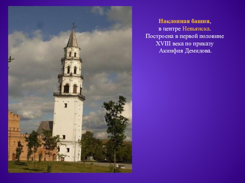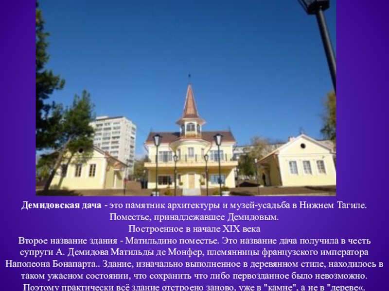 Слайд 25Демидовская дача - это памятник архитектуры и музей-усадьба в Нижнем Тагиле.
