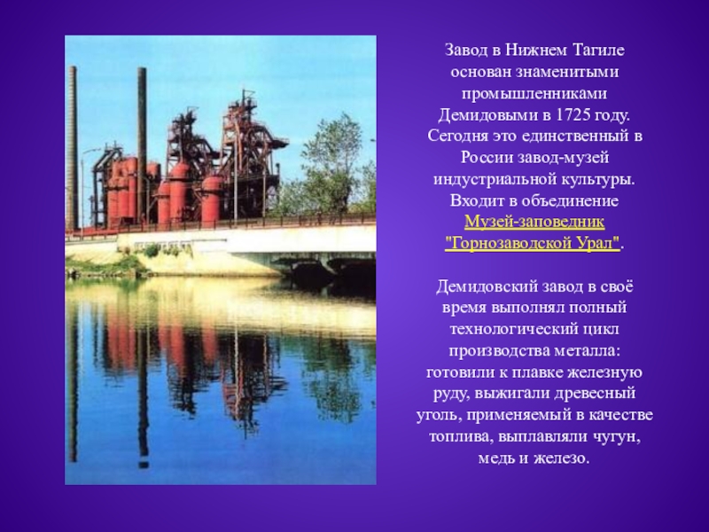 Демидовский завод в своё время выполнял полный технологический цикл производства металла: готовили к плавке железную руду, выжигали древесный уголь, применяемый в качестве топлива, выплавляли чугун, медь и железо.