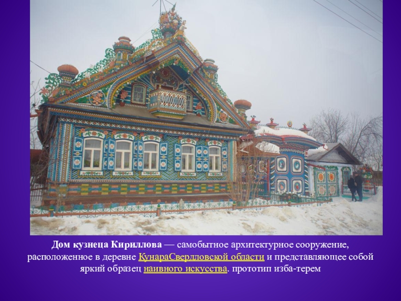 Слайд 29Дом кузнеца Кириллова — самобытное архитектурное сооружение, расположенное в деревне КунараСвердловской области и представляющее