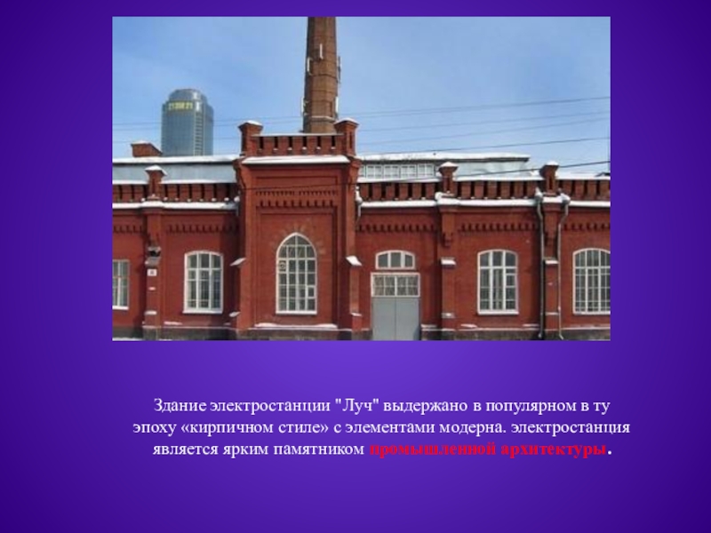 Слайд 12Здание электростанции "Луч" выдержано в популярном в ту эпоху «кирпичном стиле»