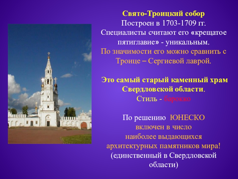 Слайд 33Свято-Троицкий собор Алапаевска 1702 год — один из стариннейших в Свердловской области, первый