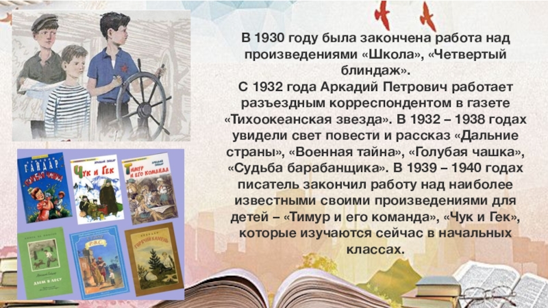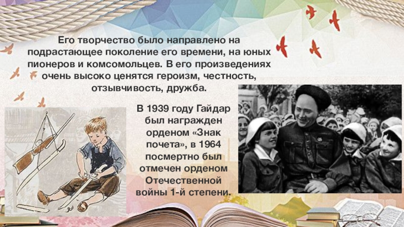 Его творчество было направлено на подрастающее поколение его времени, на юных пионеров и комсомольцев. В его произведениях очень высоко ценятся героизм, честность, отзывчивость, дружба.