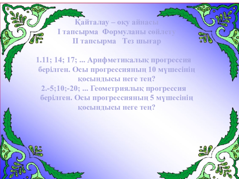 11; 14; 17; ... Арифметикалық прогрессия берілген. Осы прогрессияның 10 мүшесінің қосындысы неге тең?