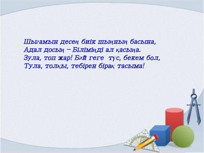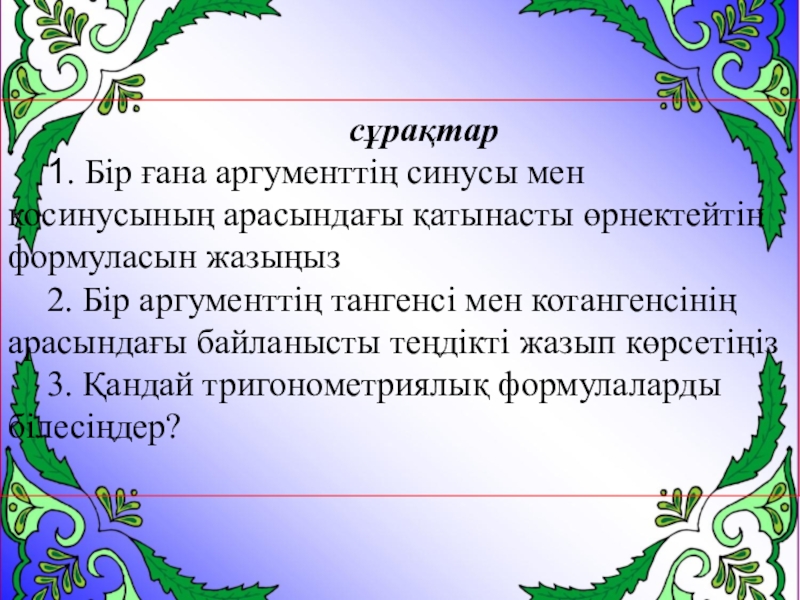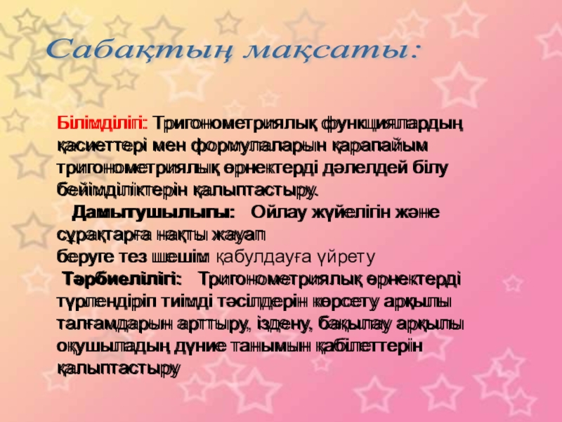 Білімділігі: Тригонометриялық функциялардың қасиеттері мен формулаларын қарапайым тригонометриялық өрнектерді дәлелдей білу бейімділіктерін қалыптастыру.