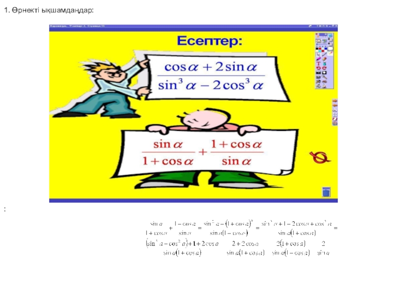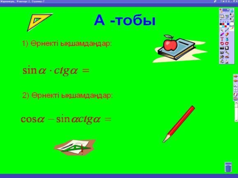 Тәрбиелілігі: Тригонометриялық өрнектерді түрлендіріп тиімді тәсілдерін көрсету арқылы талғамдарын арттыру, іздену, бақылау арқылы оқушыладың дүние танымын қабілеттерін қалыптастыру