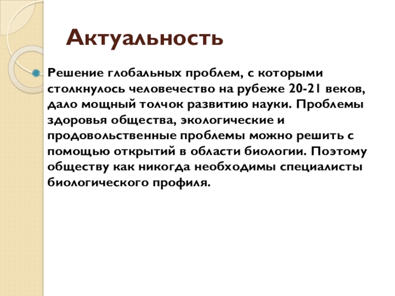 дало мощный толчок развитию науки. Проблемы здоровья общества, экологические и продовольственные проблемы можно решить с помощью открытий в области биологии. Поэтому обществу как никогда необходимы специалисты биологического профиля.