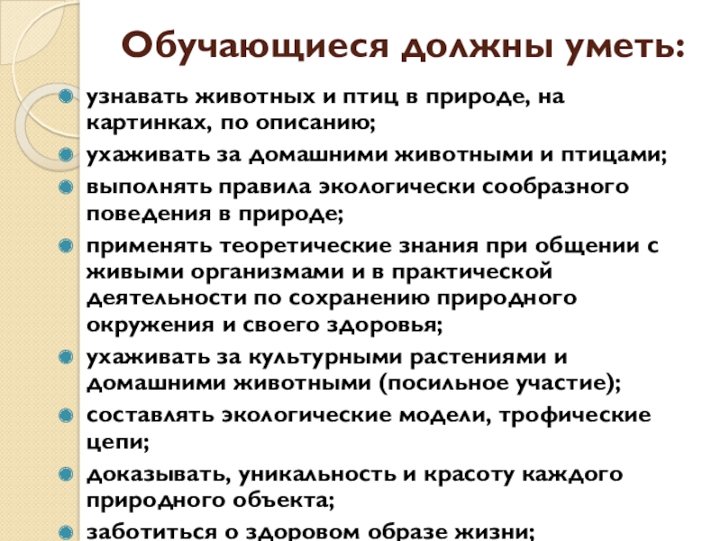 применять теоретические знания при общении с живыми организмами и в практической деятельности по сохранению природного окружения и своего здоровья;