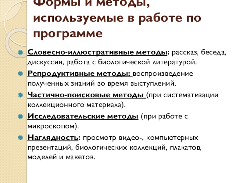Наглядность: просмотр видео-, компьютерных презентаций, биологических коллекций, плакатов, моделей и макетов.