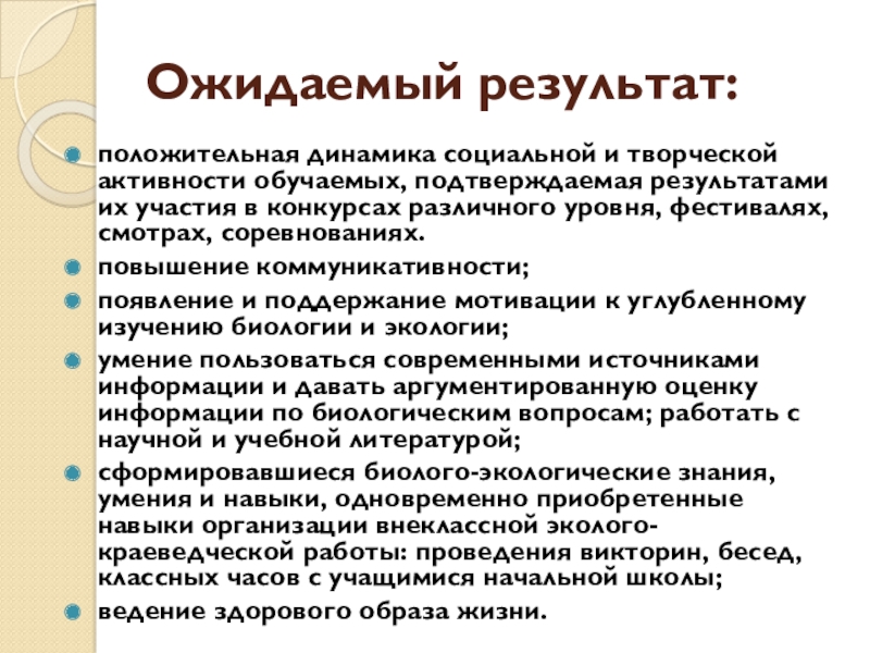 сформировавшиеся биолого-экологические знания, умения и навыки, одновременно приобретенные навыки организации внеклассной эколого-краеведческой работы: проведения викторин, бесед, классных часов с учащимися начальной школы;