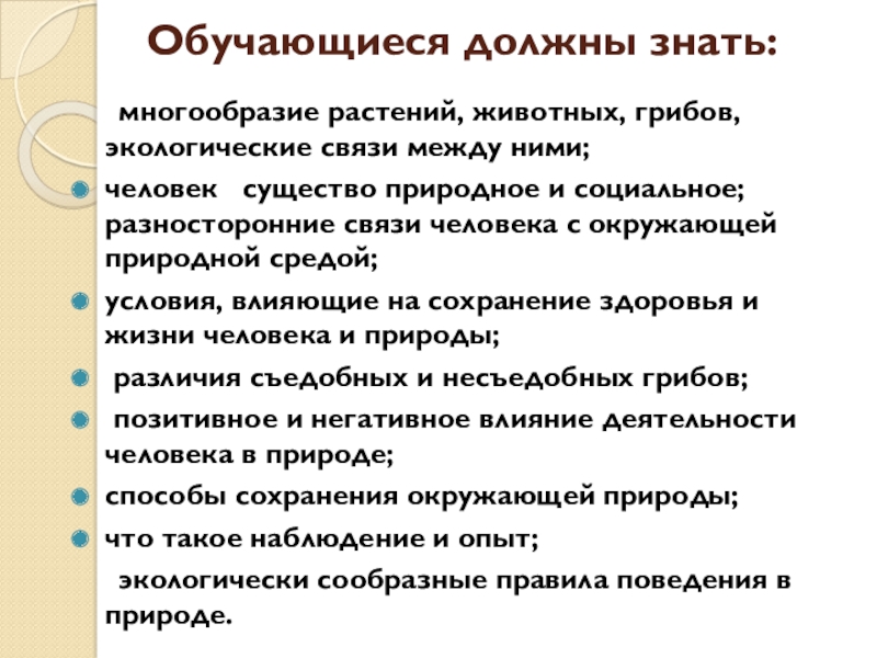 Ознакомление с видовым составом флоры и фауны окрестностей; с редкими и исчезающими растениями и животными местности; с правилами поведения в природе;