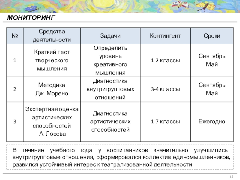 Экспериментальная деятельность направлена на развитие художественно-эстетического вкуса, творческих способностей, эмоционального восприятия и образного мышления. Формирование стремления к самовыражению через развитие лидерских качеств.