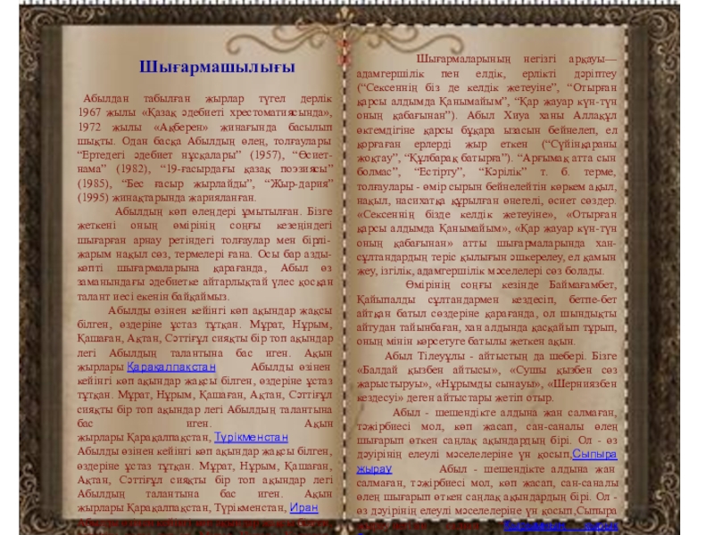 Абыл - шешендікте алдына жан салмаған, тәжірбиесі мол, көп жасап, сан-саналы өлең шығарып өткен саңлақ ақындардың бірі. Ол - өз дәуірінің елеулі мәселелеріне үн қосып,Сыпыра жырау Абыл - шешендікте алдына жан салмаған, тәжірбиесі мол, көп жасап, сан-саналы өлең шығарып өткен саңлақ ақындардың бірі. Ол - өз дәуірінің елеулі мәселелеріне үн қосып,Сыпыра жырау негізін салған “Қырымның қырық батыры” сияқты батырлық дастандарды дамыта жырлаған.