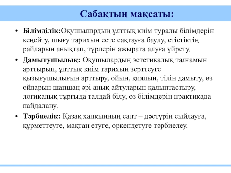 Сабақтың мақсаты: Білімділік:Оқушылпрдың ұлттық киім туралы білімдерін кеңейту, шығу тарихын есте сақтауға
