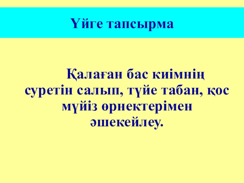 Үйге тапсырма    Қалаған бас киімнің суретін салып, түйе табан, қос мүйіз өрнектерімен әшекейлеу.