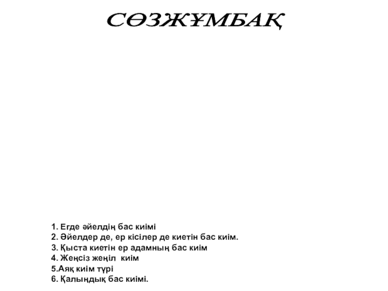 СӨЗЖҰМБАҚ 1. Егде әйелдің бас киімі2. Әйелдер де, ер кісілер де киетін бас киім.3. Қыста киетін ер