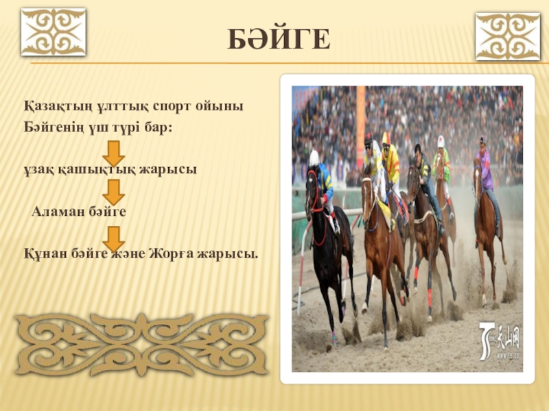Бәйге   Қазақтың ұлттық спорт ойыныБәйгенің үш түрі бар: ұзақ қашықтық жарысы Аламан бәйгеҚұнан бәйге және Жорға