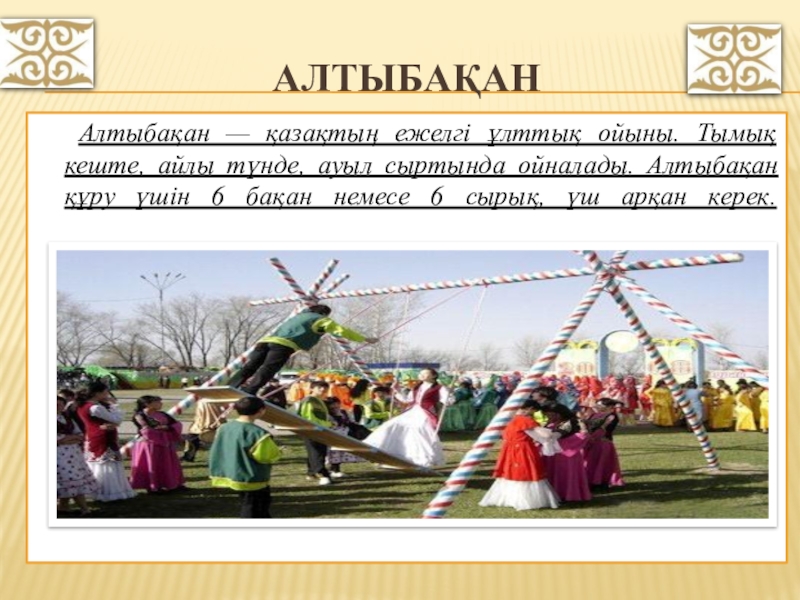 Алтыбақан  Алтыбақан — қазақтың ежелгі ұлттық ойыны. Тымық кеште, айлы түнде, ауыл сыртында ойналады. Алтыбақан құру