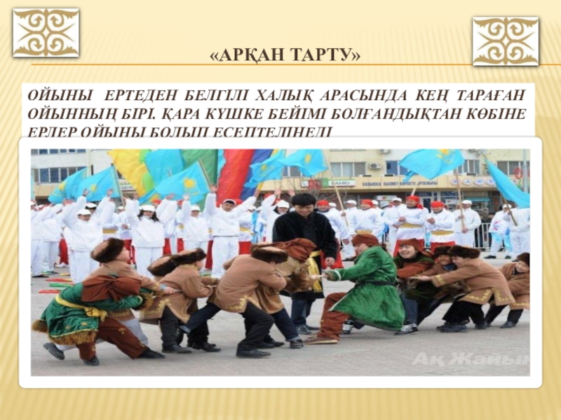 «Арқан тарту» ойыны  ертеден белгілі халық арасында кең тараған ойынның бірі. Қара күшке бейімі болғандықтан көбіне ерлер ойыны