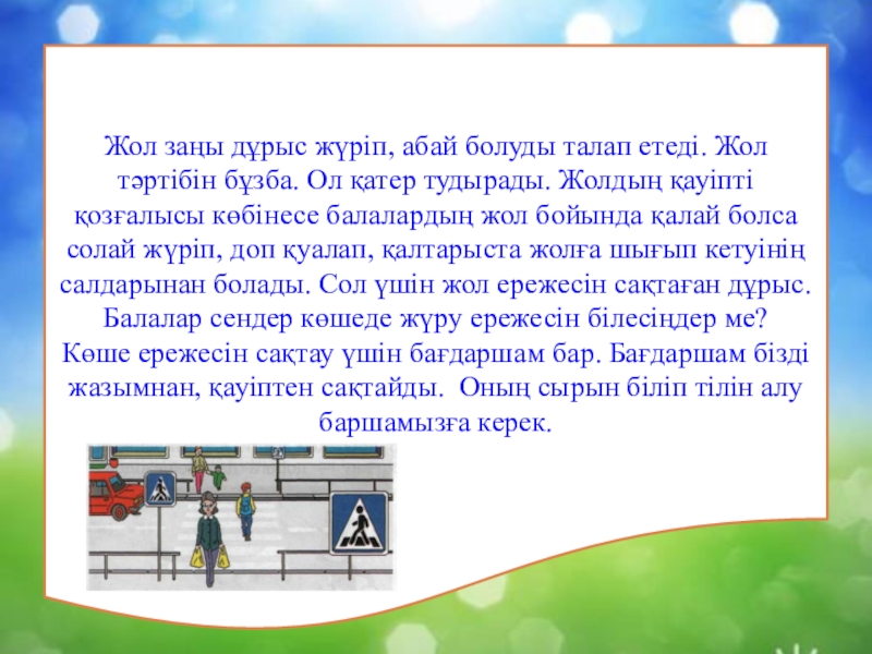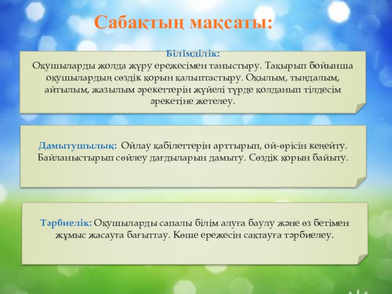 Тәрбиелік: Оқушыларды сапалы білім алуға баулу және өз бетімен жұмыс жасауға бағыттау. Көше ережесін сақтауға тәрбиелеу.