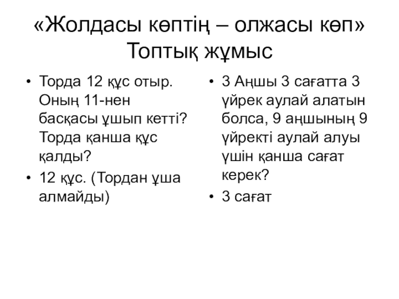 3 Аңшы 3 сағатта 3 үйрек аулай алатын болса, 9 аңшының 9 үйректі аулай алуы үшін қанша сағат керек?