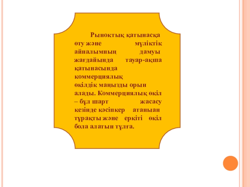 өту және мүліктік айналымның дамуы жағдайында тауар-ақша қатынасында коммерциялық өкілдік маңызды орын алады. Коммерциялық өкіл – бұл шарт жасасу кезінде кәсіпкер атаныан тұрақты және еркіті өкіл бола алатын тұлға.