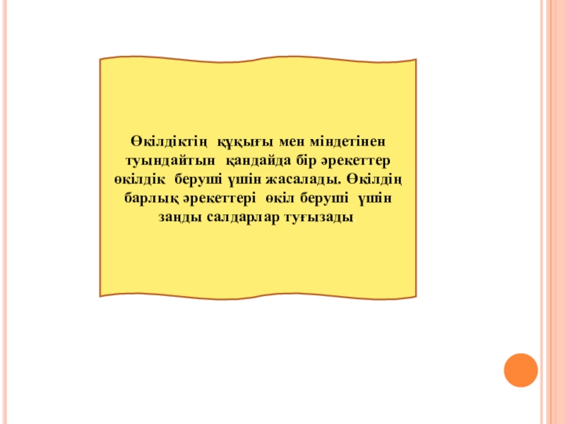 Слайд 13Өкілдіктің құқығы мен міндетінен туындайтын қандайда бір әрекеттер өкілдік беруші үшін жасалады.
