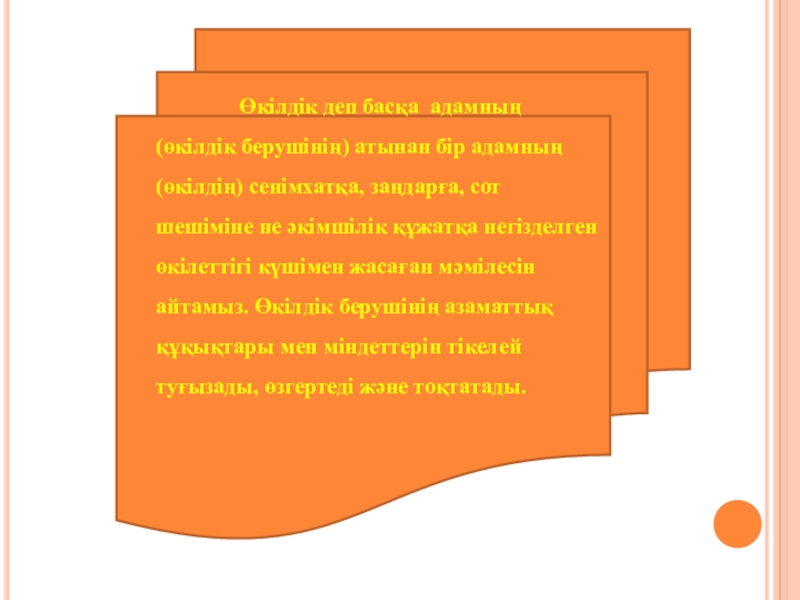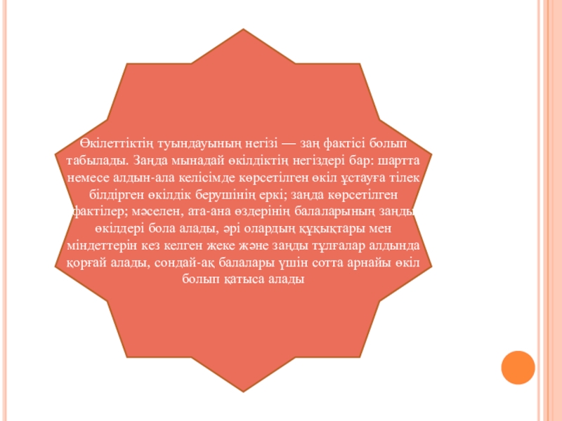 Слайд 3Өкілеттіктің туындауының негізі — заң фактісі болып табылады. Заңда мынадай өкілдіктің негіздері