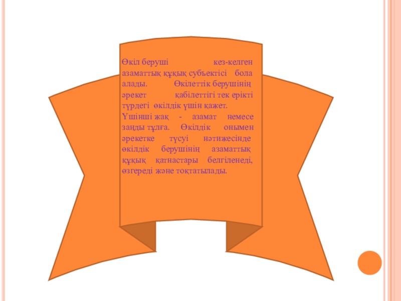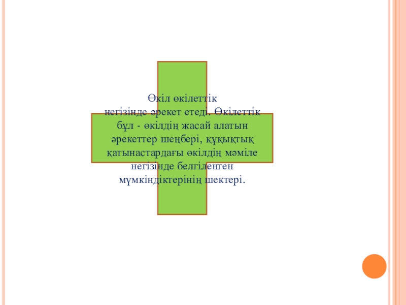 Слайд 14Өкіл өкілеттік негізінде әрекет етеді. Өкілеттік бұл - өкілдің жасай алатын әрекеттер шеңбері, құқықтық қатынастардағы