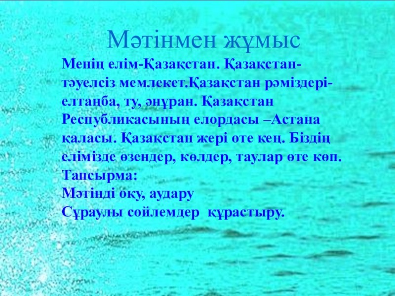 Мәтінмен жұмысМенің елім-Қазақстан. Қазақстан-тәуелсіз мемлекет.Қазақстан рәміздері- елтаңба, ту, әнұран. Қазақстан Республикасының елордасы –Астана қаласы. Қазақстан жері өте