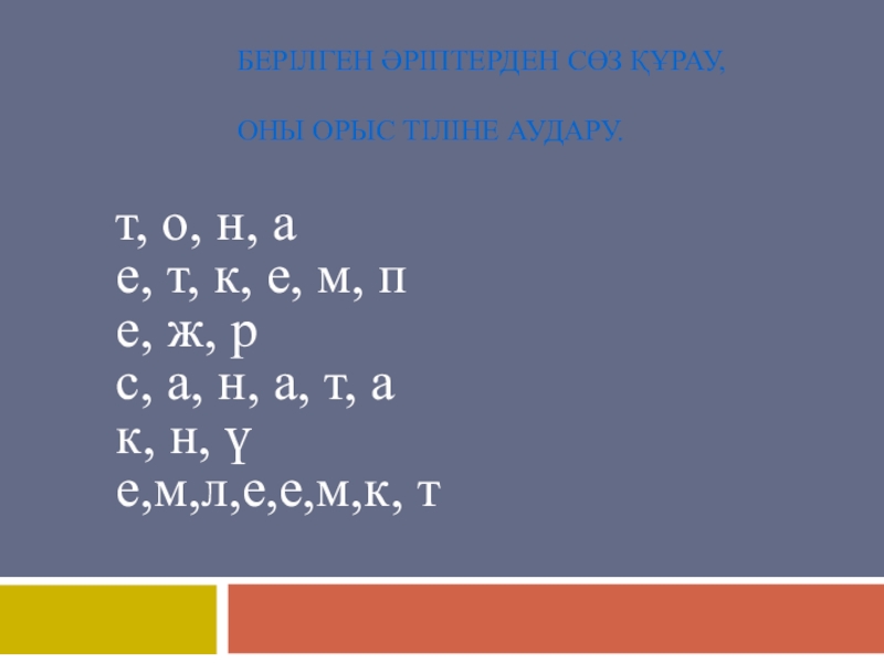 Слайд 7Берілген әріптерден сөз құрау, оны орыс тіліне аудару.