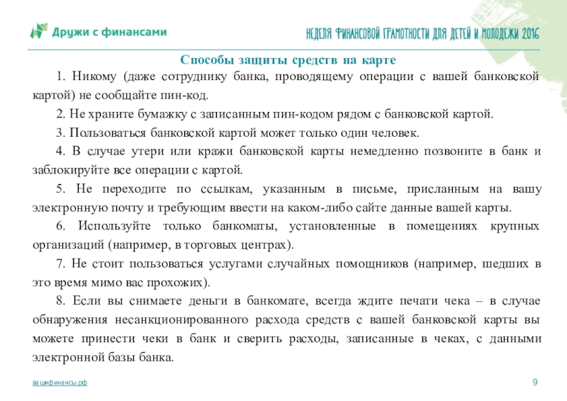 8. Если вы снимаете деньги в банкомате, всегда ждите печати чека – в случае обнаружения несанкционированного расхода средств с вашей банковской карты вы можете принести чеки в банк и сверить расходы, записанные в чеках, с данными электронной базы банка.