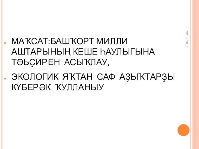 Слайд 2МАҠСАТ:БАШҠОРТ МИЛЛИ АШТАРЫНЫҢ КЕШЕ ҺАУЛЫГЫНА ТӘЬҪИРЕН АСЫҠЛАУ,