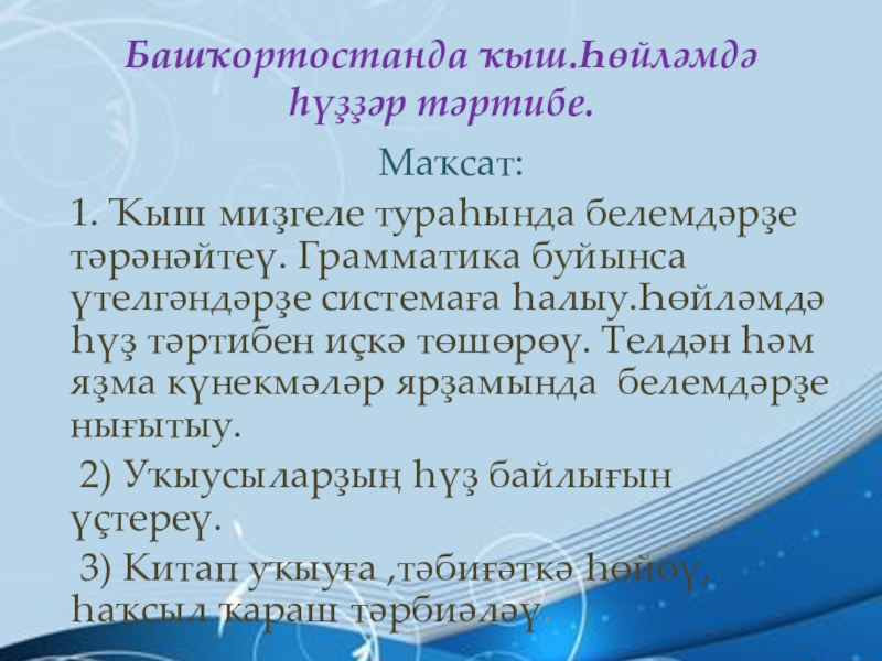 үтелгәндәрҙе системаға һалыу.Һөйләмдә һүҙ тәртибен иҫкә төшөрөү. Телдән һәм яҙма күнекмәләр ярҙамында белемдәрҙе нығытыу.