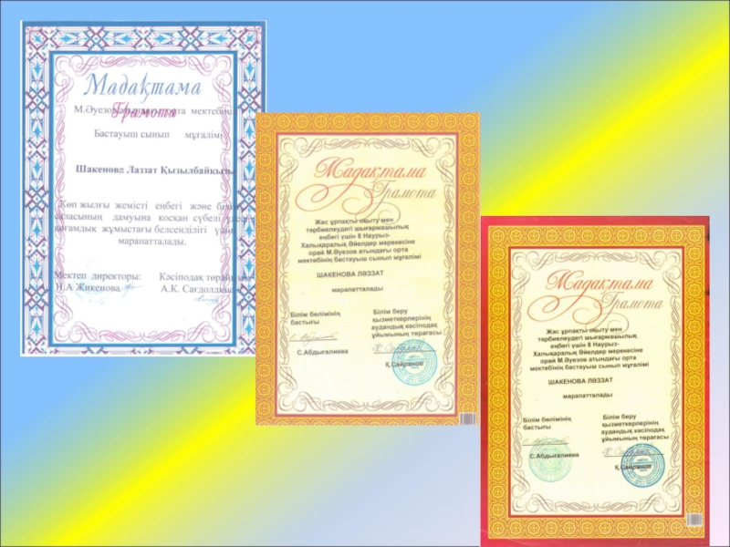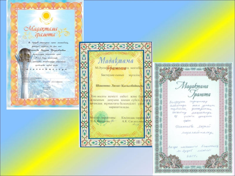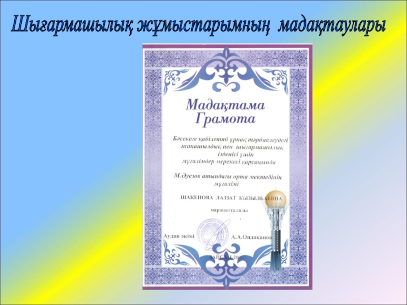 Слайд 9Шығармашылық жұмыстарымның мадақтаулары