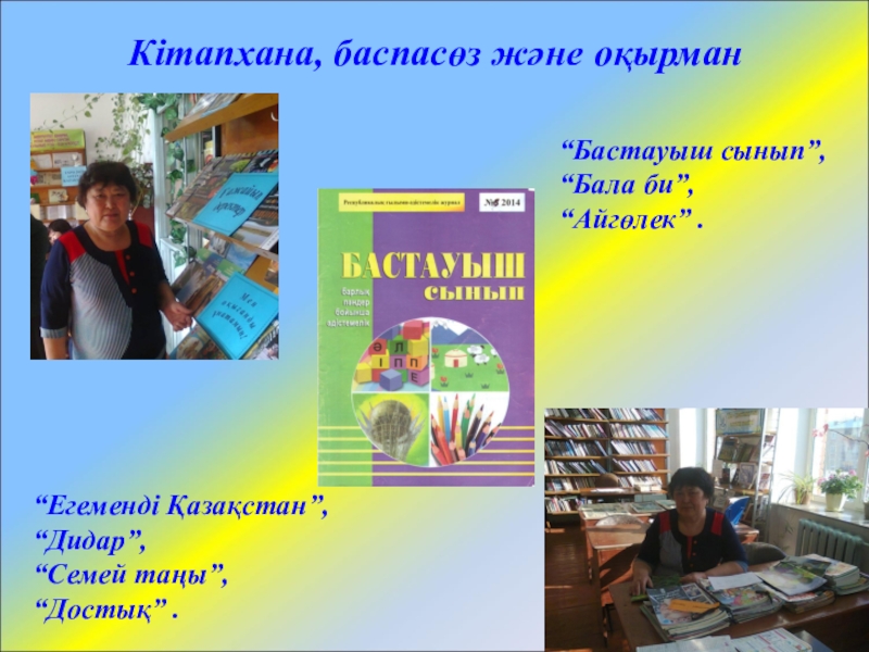 Кітапхана, баспасөз және оқырман “Бастауыш сынып”, “Бала би”, “Айгөлек” .“Егеменді Қазақстан”, “Дидар”, “Семей таңы”, “Достық” .