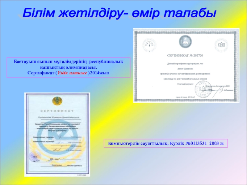 Компьютерлік сауаттылық. Куәлік №0113531 2003 жБілім жетілдіру- өмір талабы Бастауыш сынып мұғалімдерінің республикалық қашықтық олимпиадасы. Сертификат (Үздік