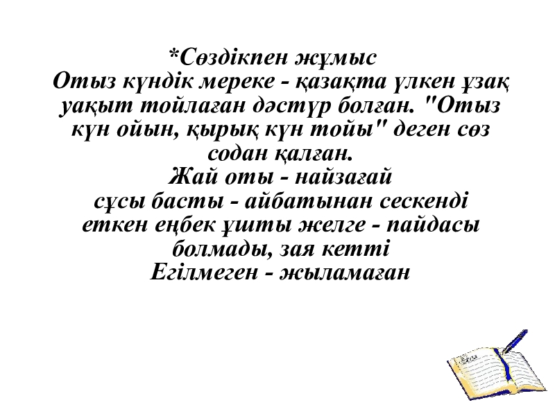 Слайд 6*Сөздікпен жұмыс Отыз күндік мереке - қазақта үлкен ұзақ уақыт тойлаған дәстүр
