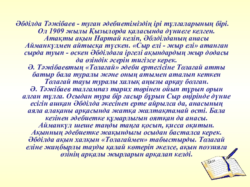 Ә. Тәжібаевтың өмір жолы мен Толағай ертегісін оқып, мазмұндау. Толағай ертегісінен