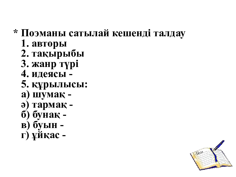* Поэманы сатылай кешенді талдау 1. авторы 2. тақырыбы 3. жанр түрі 4. идеясы - 5.