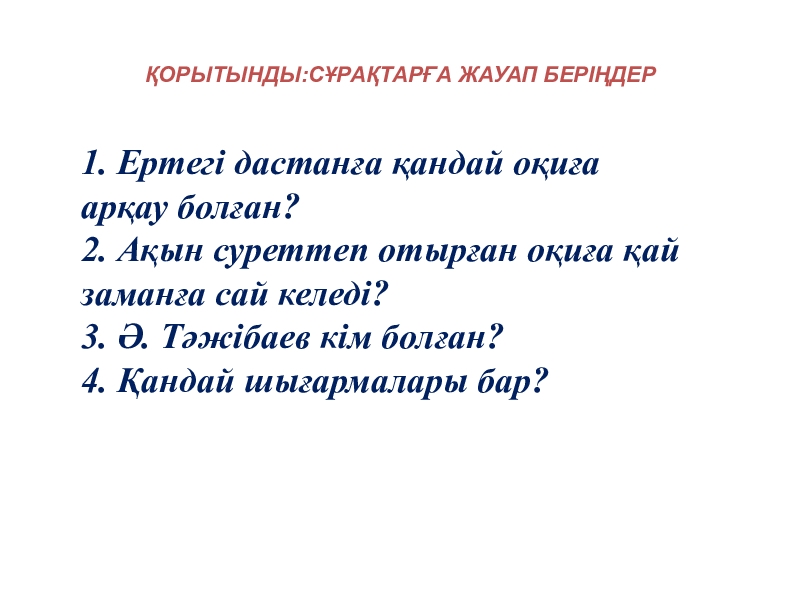 отырған оқиға қай заманға сай келеді? 3. Ә. Тәжібаев кім болған? 4. Қандай шығармалары бар?