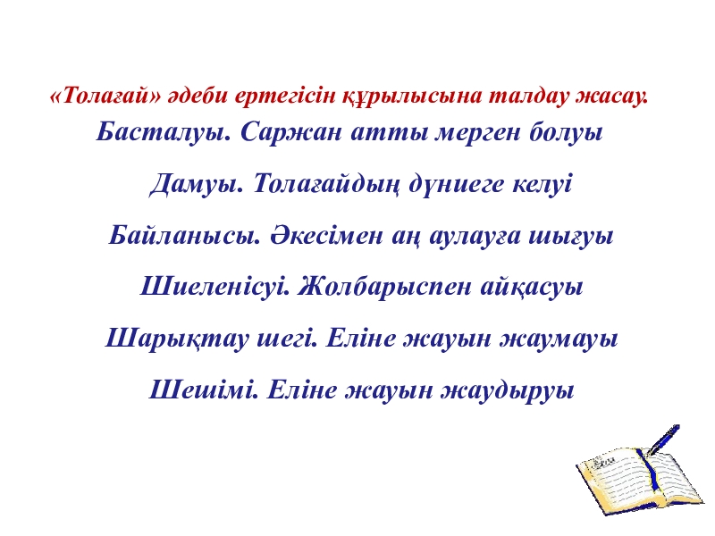 «Толағай» әдеби ертегісін құрылысына талдау жасау.